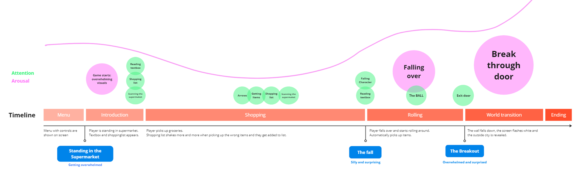 We mapped the intended experience arc and tested it using FACS and GSR analysis, tracking real player reactions. The data confirmed big spikes in excitement during the supermarket breakout! As Art Director, I tuned color, composition, and visual pacing around these emotional peaks, making sure they amplified the experience we wanted players to have.