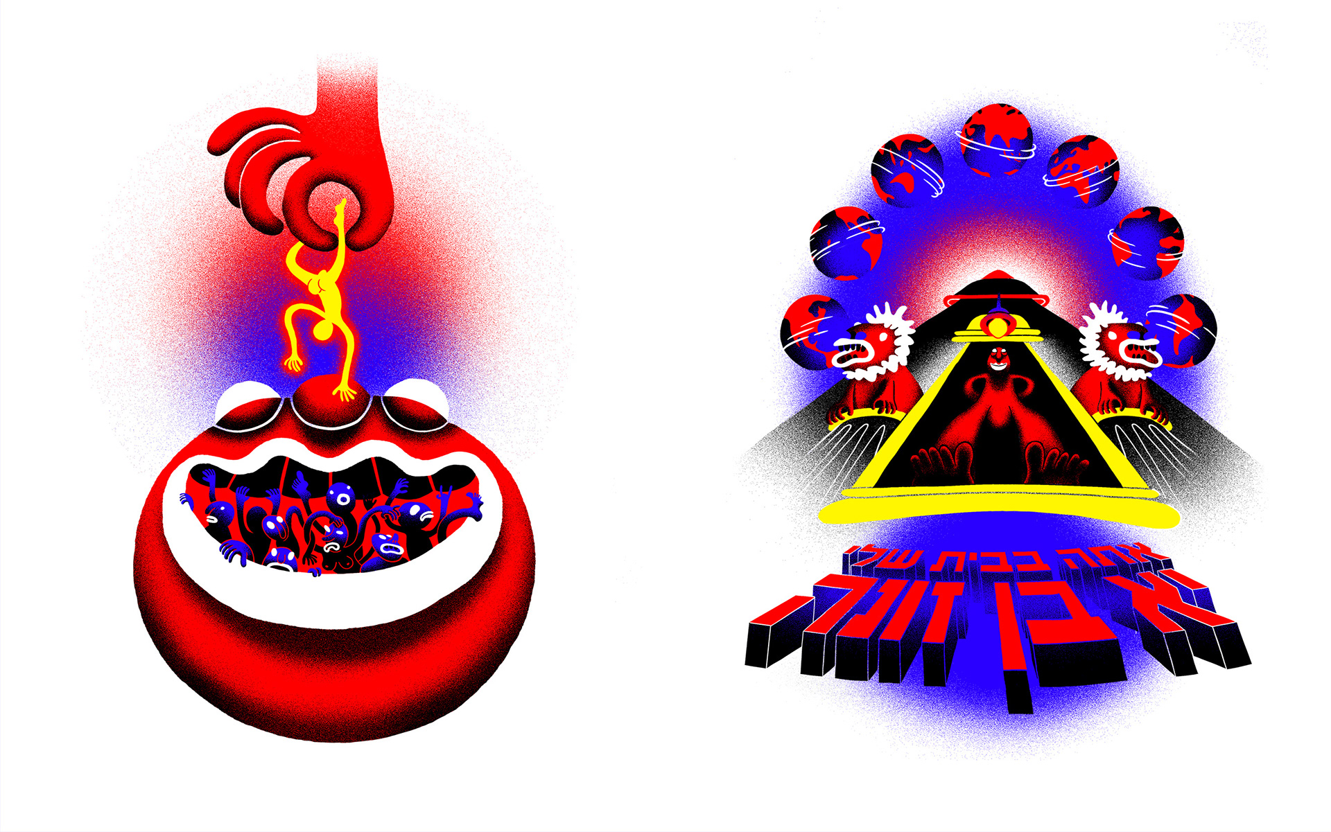 Illustrations for a faux festival, 'Avira' - a pun on the Hebrew words for "ambience" and "bad air". The festival addresses air pollution in the city of Haifa by presenting its iconic industrial cooling towers and toxic particulates as adorable creatures, and offering merch such as flavored asthma inhalers and oxygen masks.